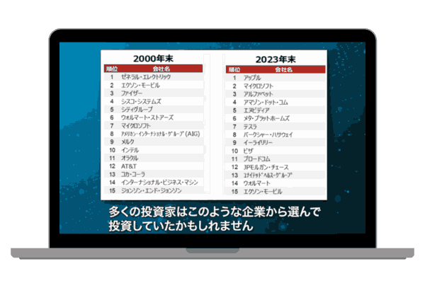 ゼネラル・エレクトリックは現在50位、ファイザーは59位、にまでなっています。いくら間違いない投資先だと思われていたような企業でも、20年経てば、見る影も無くなってしまうのです。(※2023年3月時点の時価総額より)