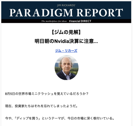 いくつかの投資レポートや分析情報を読んでみても、判断要素に明確な自信が持てず、価格が上下するたびに慌てて高値で飛びついたり、損切りしたりしていました。そんな中で、ジム・リカーズさんの情報や見ている視点が私には思いもしないところや、結論に至るまでのロジックの説得力や緻密さに文句がつけられません。